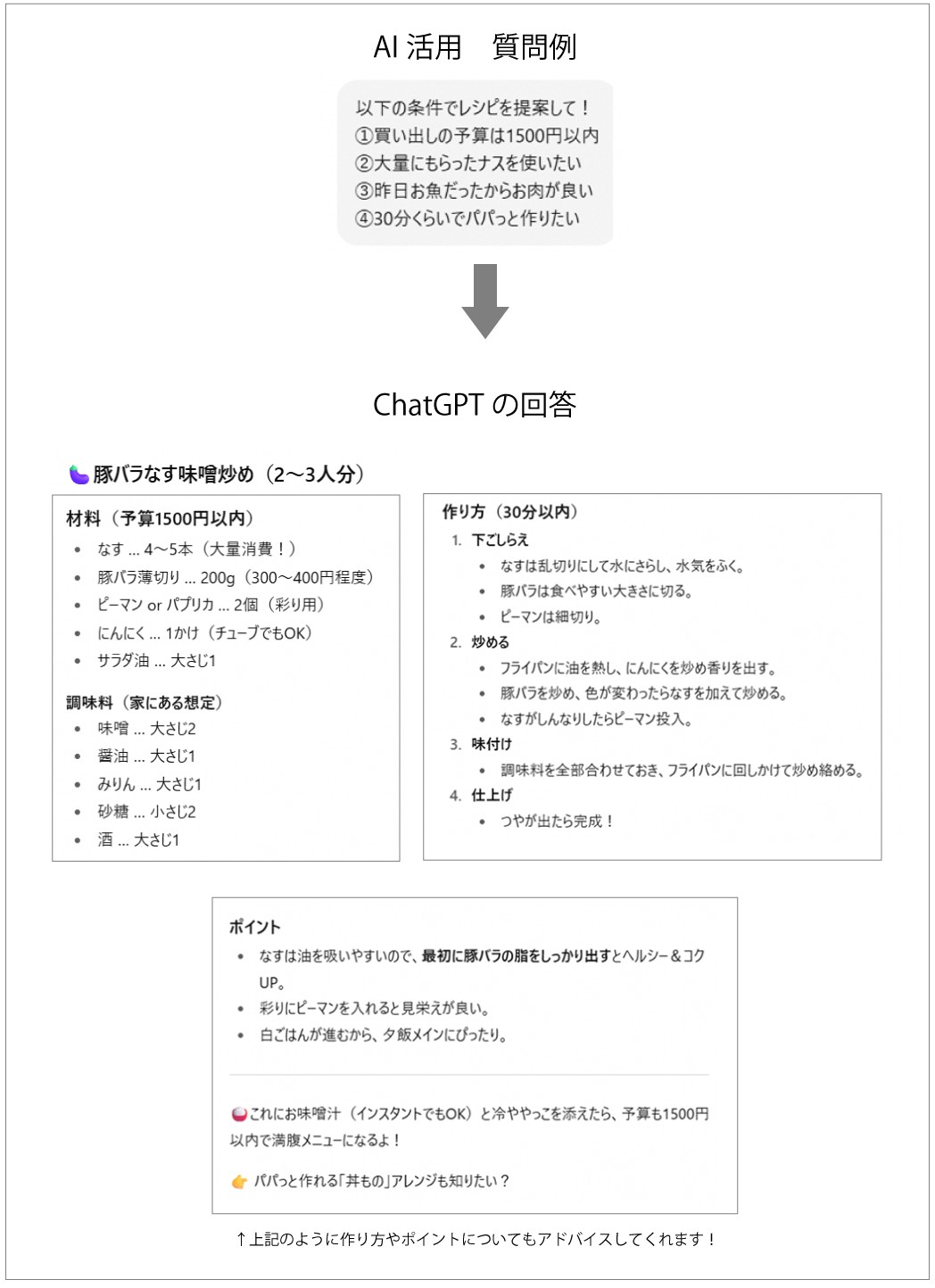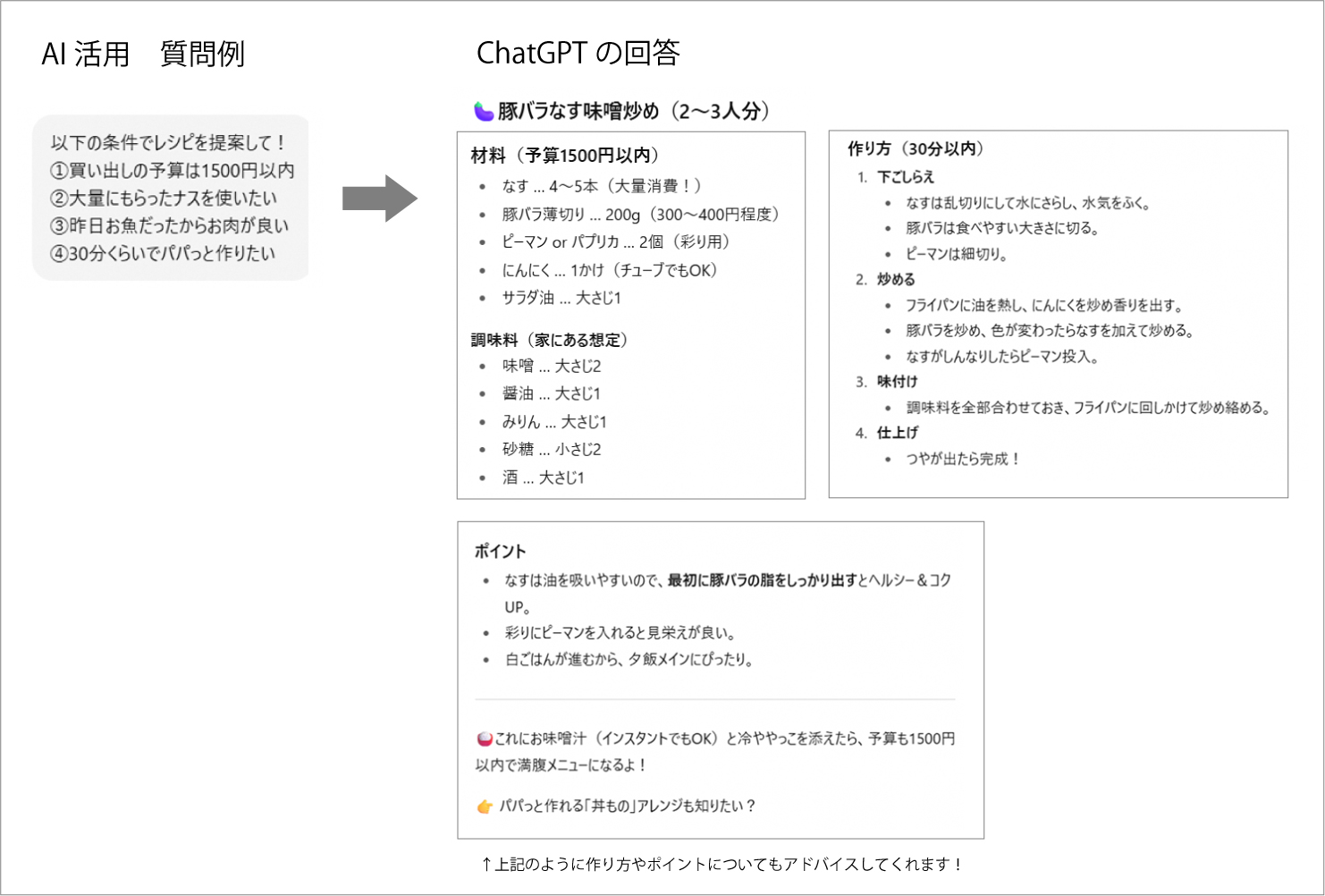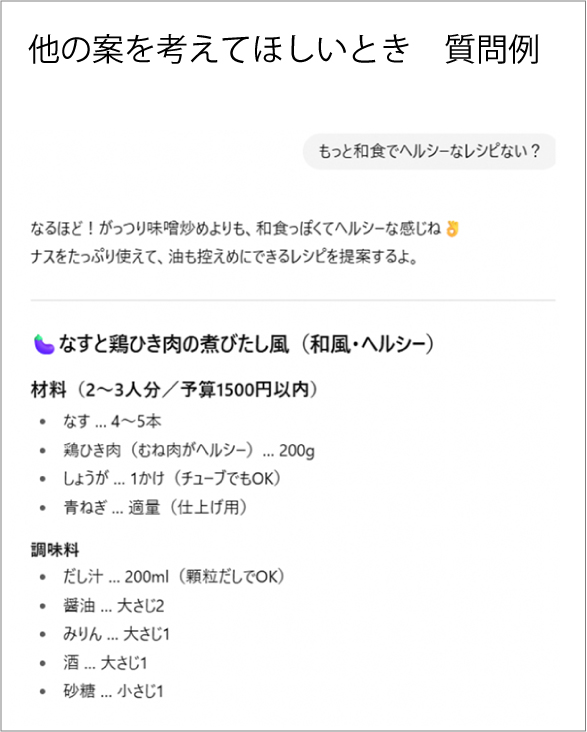 たしかに、AIなら気を遣うことなく、納得がいくまでレシピ案を出してもらえますね!