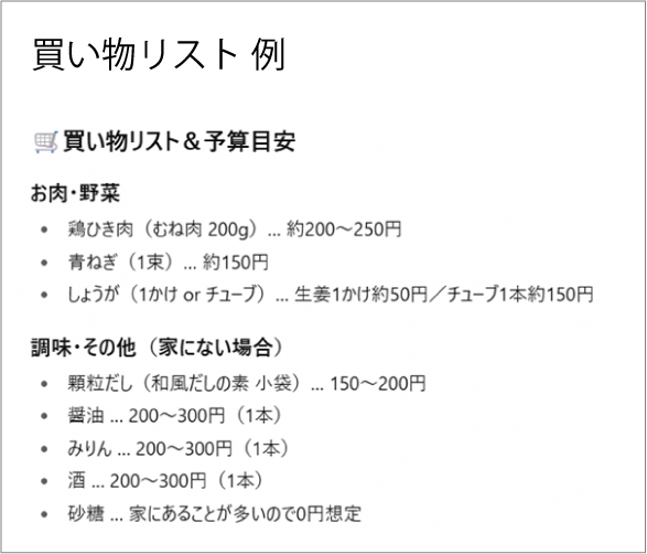 あと、AIはレシピに沿った「買い物リスト」も出してくれるので、買い忘れも防げますよね。
